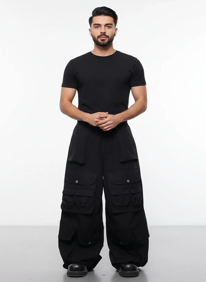 These 3D-Flap Cargo Pants for men come in a black color, have a wide leg style, and...