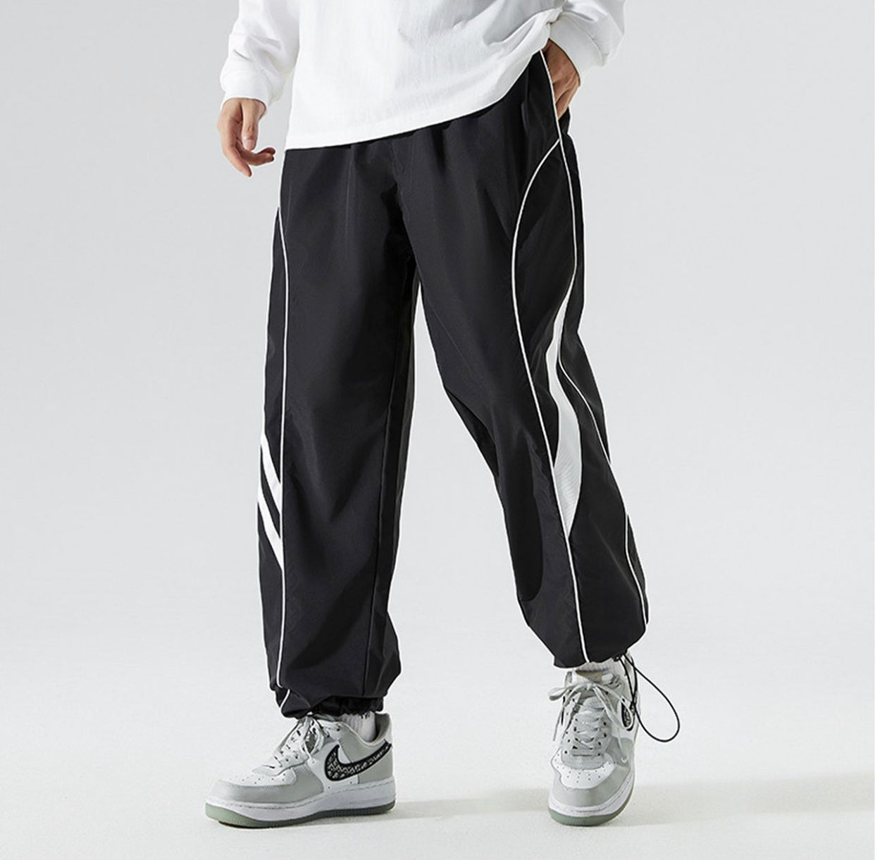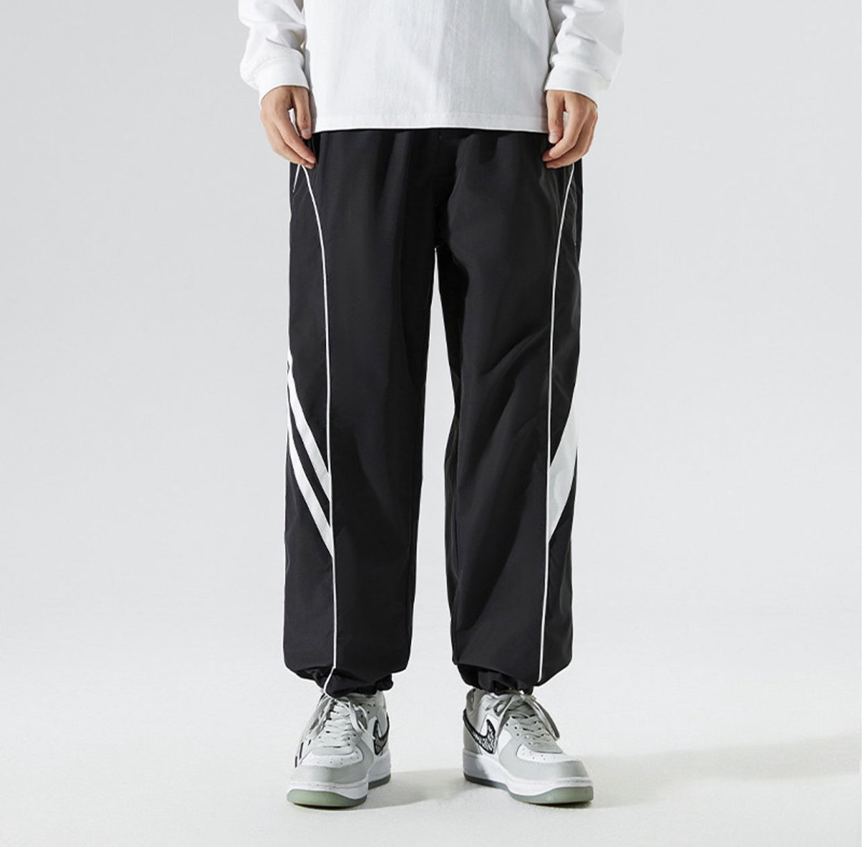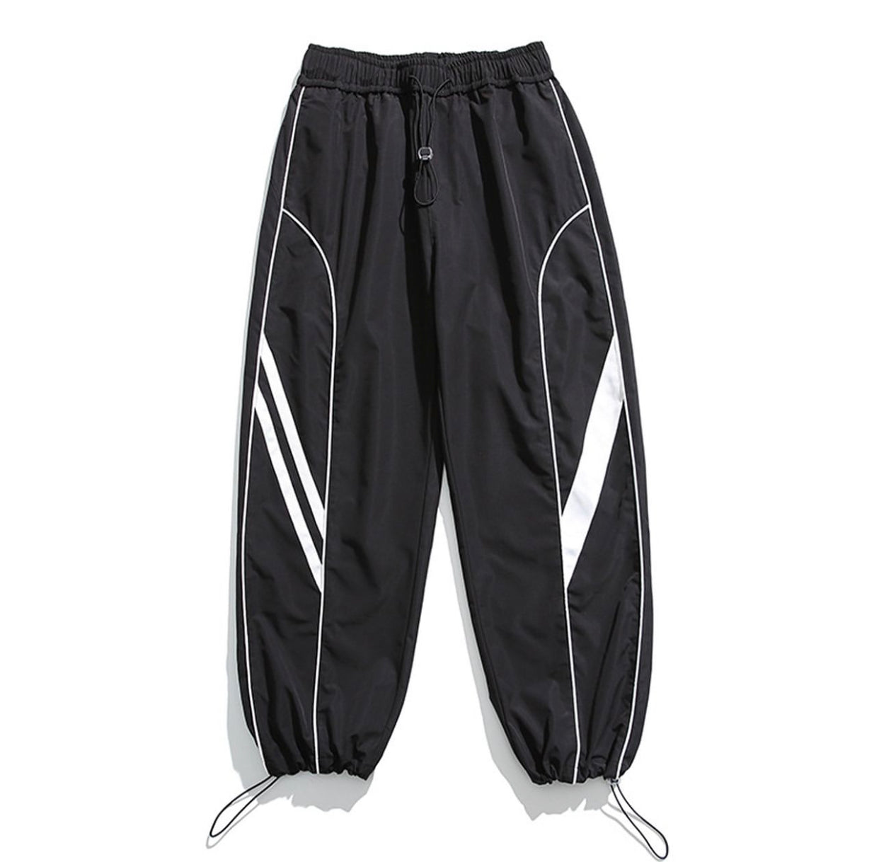 This pair of unisex track pants features a classic black color, straight/wide leg style, and a contrast pipe-in pattern. It has a drawstring waist closure, natural waistline, and long length, providing a casual fit with a non-stretch fabric made from 100% blended cotton. The pants also come with side pockets, are unlined, and have no sheer elements. Care instructions include machine washing or professional dry cleaning.