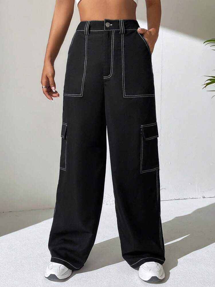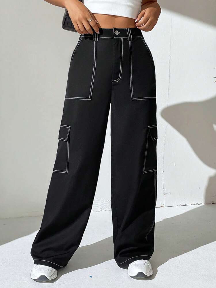 The Contrast Stich- Cargo Pants are a pair of straight/wide legged, black cargo pants designed for women. Made from 100% cotton and with a natural waistline, these pants feature side pockets and flap pockets for added functionality. They have a baggy fit and are unlined, making them perfect for everyday wear. Additionally, they can be easily machine washed or professionally dry cleaned for care. These pants have a formal, educational tone and use scientific and objective language, making them suitable for any industry expert.