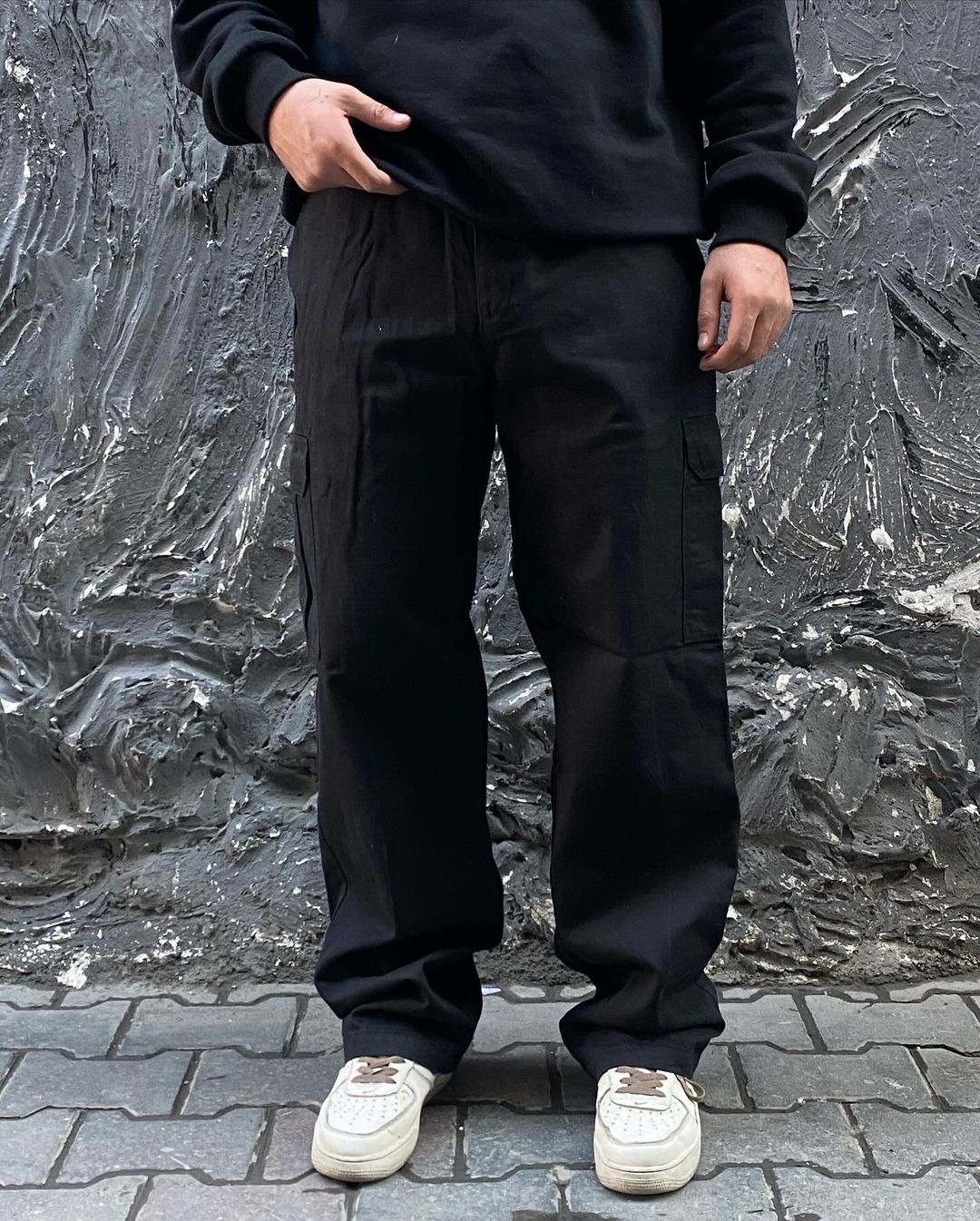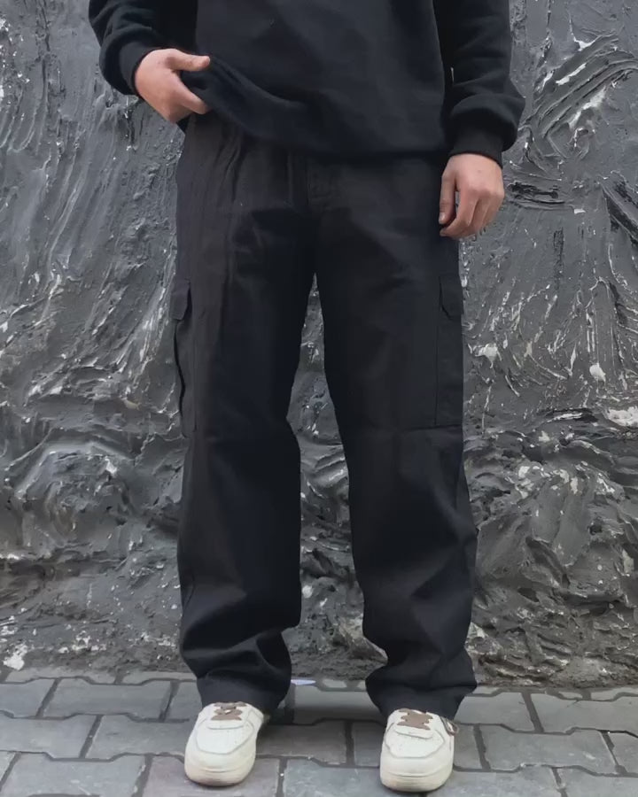 Men Urban Cargo Pants in black, featuring a Straight/Wide leg style, with a Pant pattern type. The pants have side pockets and flap pockets, and are a baggy fit with a natural waistline. Made with non-stretch, 100% blended cotton material, perfect for the spring and summer seasons. They can be machine washed or professionally dry cleaned, and the body is unlined with no sheer aspects.