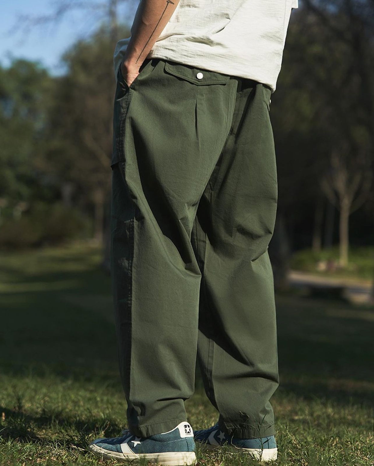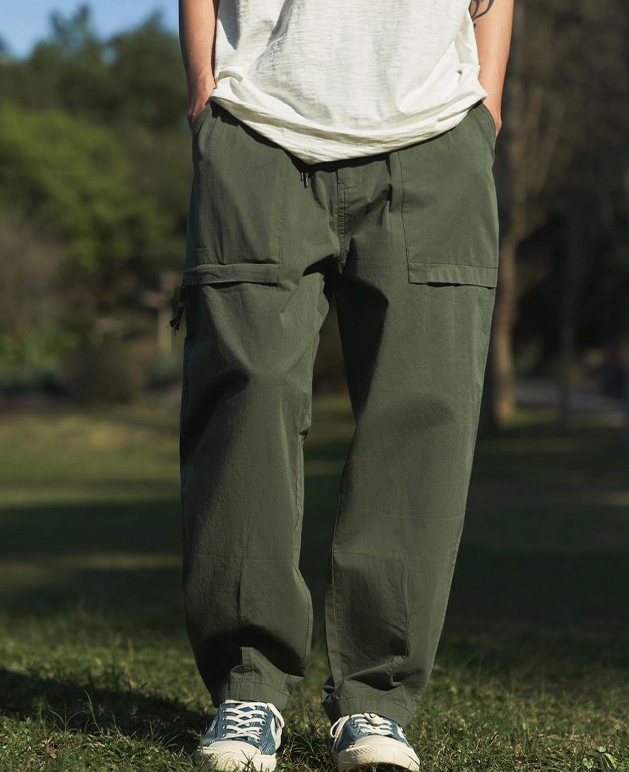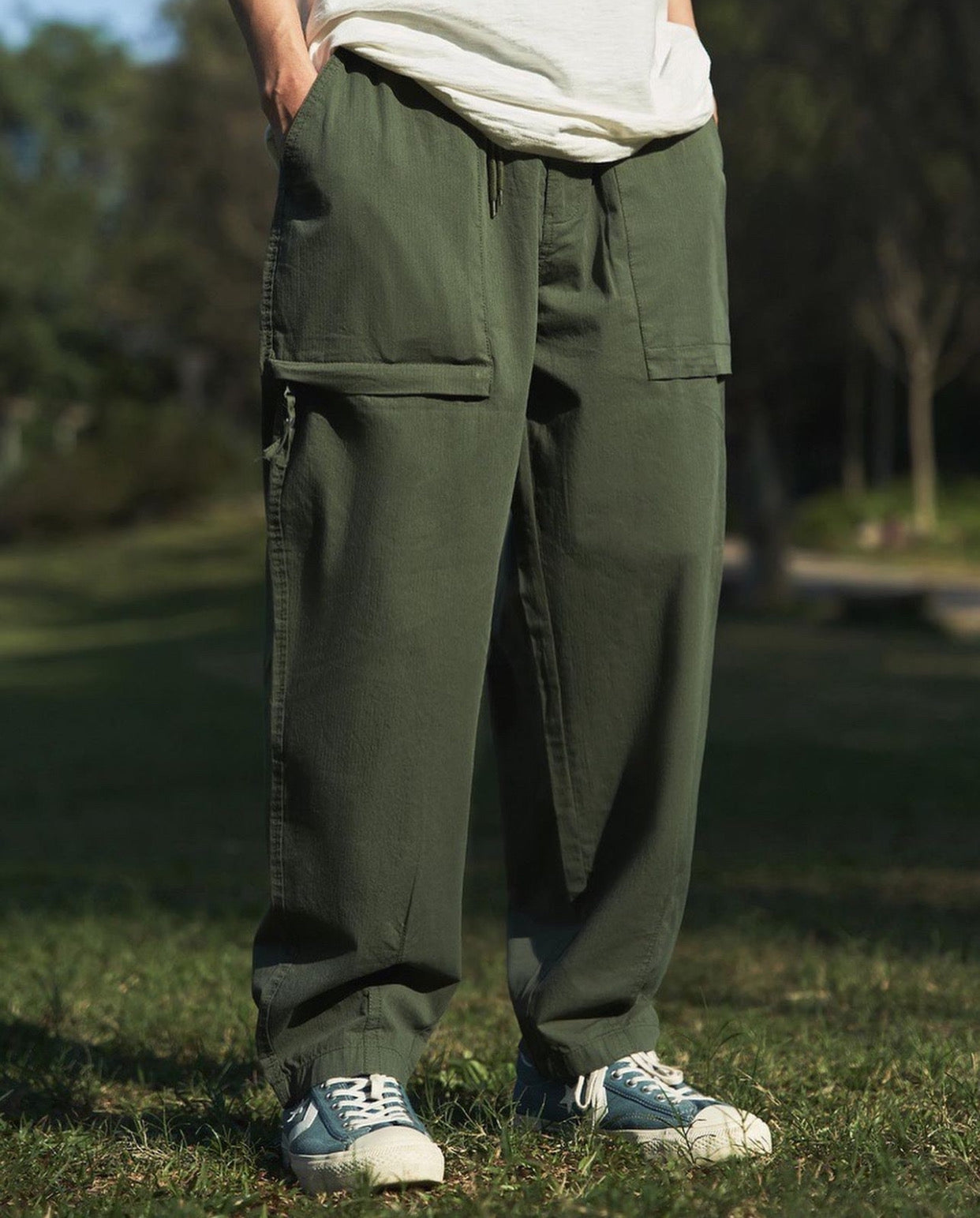 These unisex pants come in black, beige, and olive green, have a straight leg style, and feature side pockets. They are parch pocket pants with a drawstring + button closure, and a natural waist line. Made of 100% blended cotton. Machine wash or professionally dry clean. Please note that Screen resolution and brightness may affect product color.
