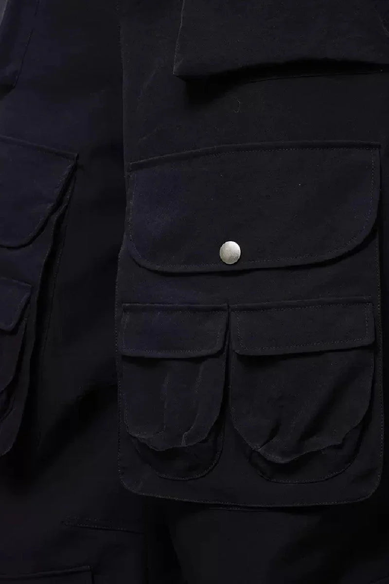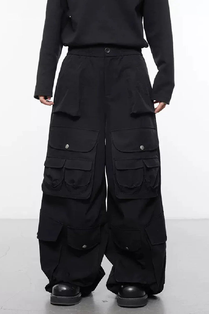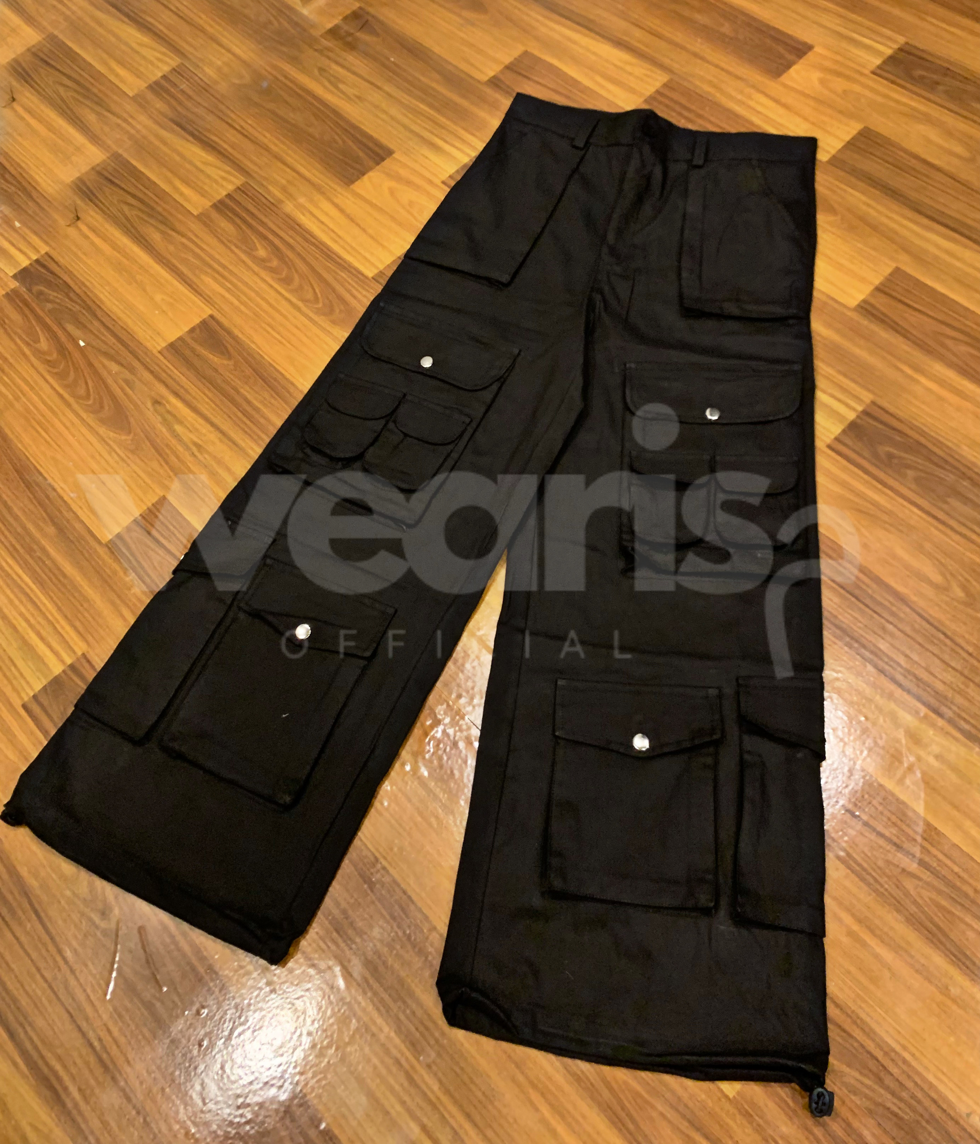 Unisex, Black, Wide leg, Pant, Multiple pockets, Cargo pants, Button closure, Natural waistline, Long length, Baggy fit, Non-Stretch fabric, 100% Cotton material, Machine wash/professional dry cleanable, Unlined body, Not sheer.