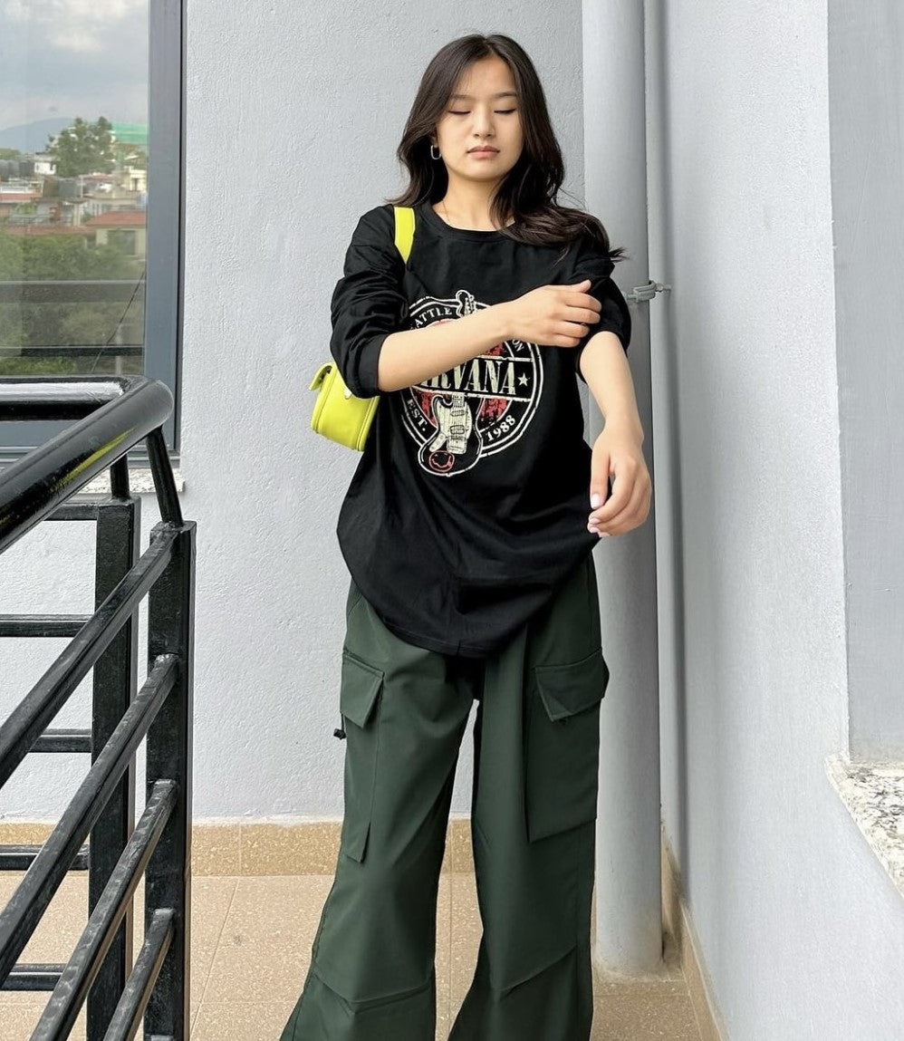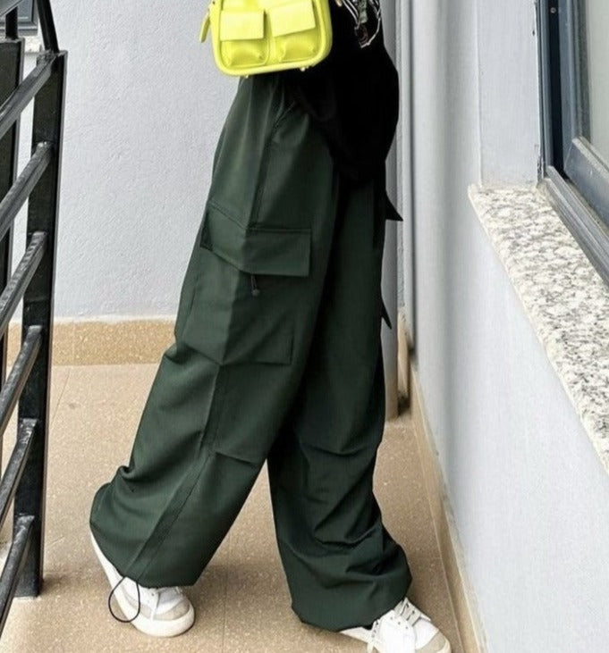 These Green Urban Cargos are unisex and come in an olive green color. The style is wide leg with a drawstring waist and natural waistline. Featuring urban-inspired details such as side and flap pockets, these cargo pants offer both functionality and style. The fabric is non-stretch 100% cotton parachute material, and the pants have a baggy, comfortable fit. Easy to care for, they can be either machine washed or professionally dry cleaned. They are unlined and not sheer, but please note that there may be a slight color difference due to screen resolution or brightness.